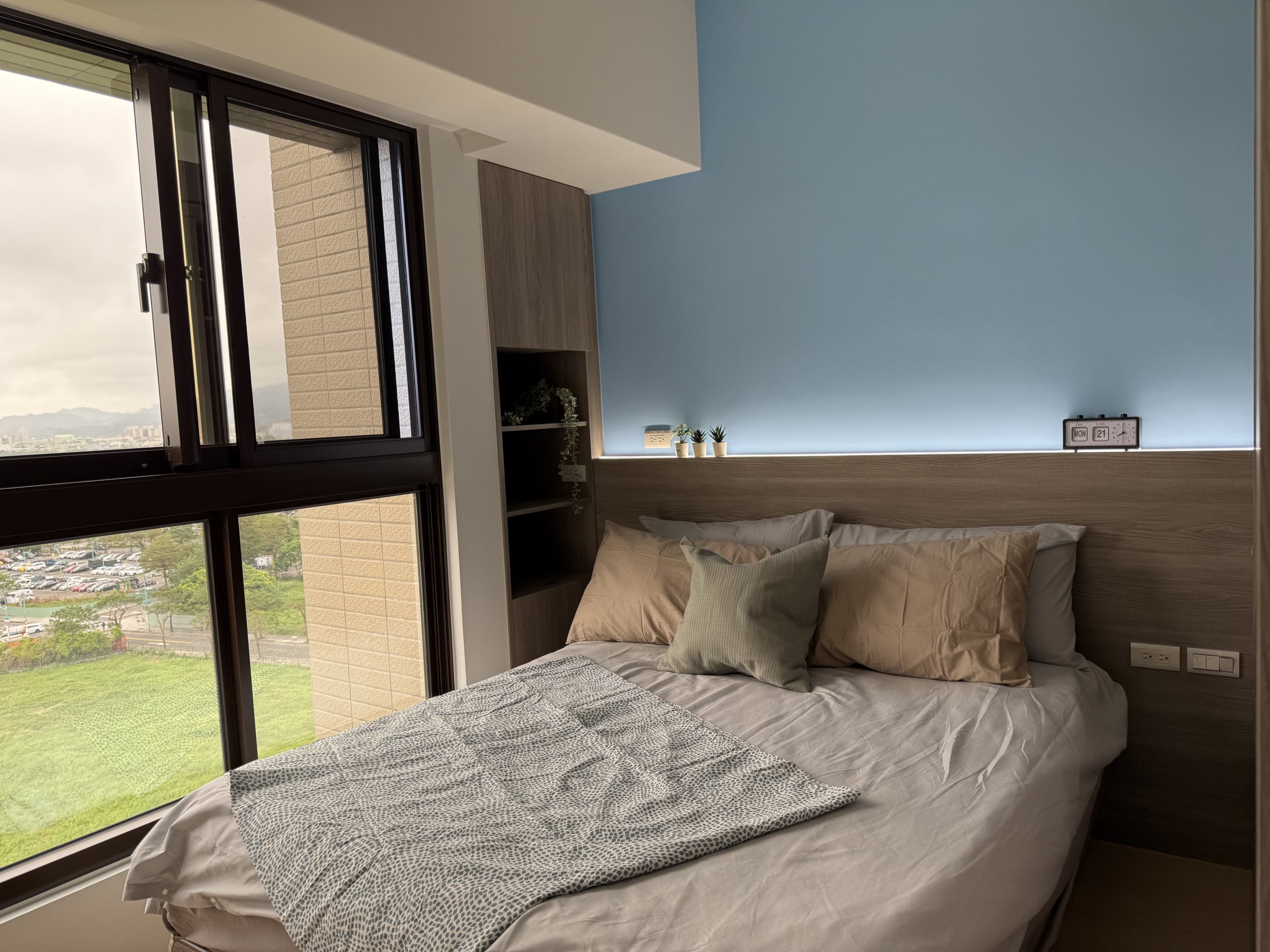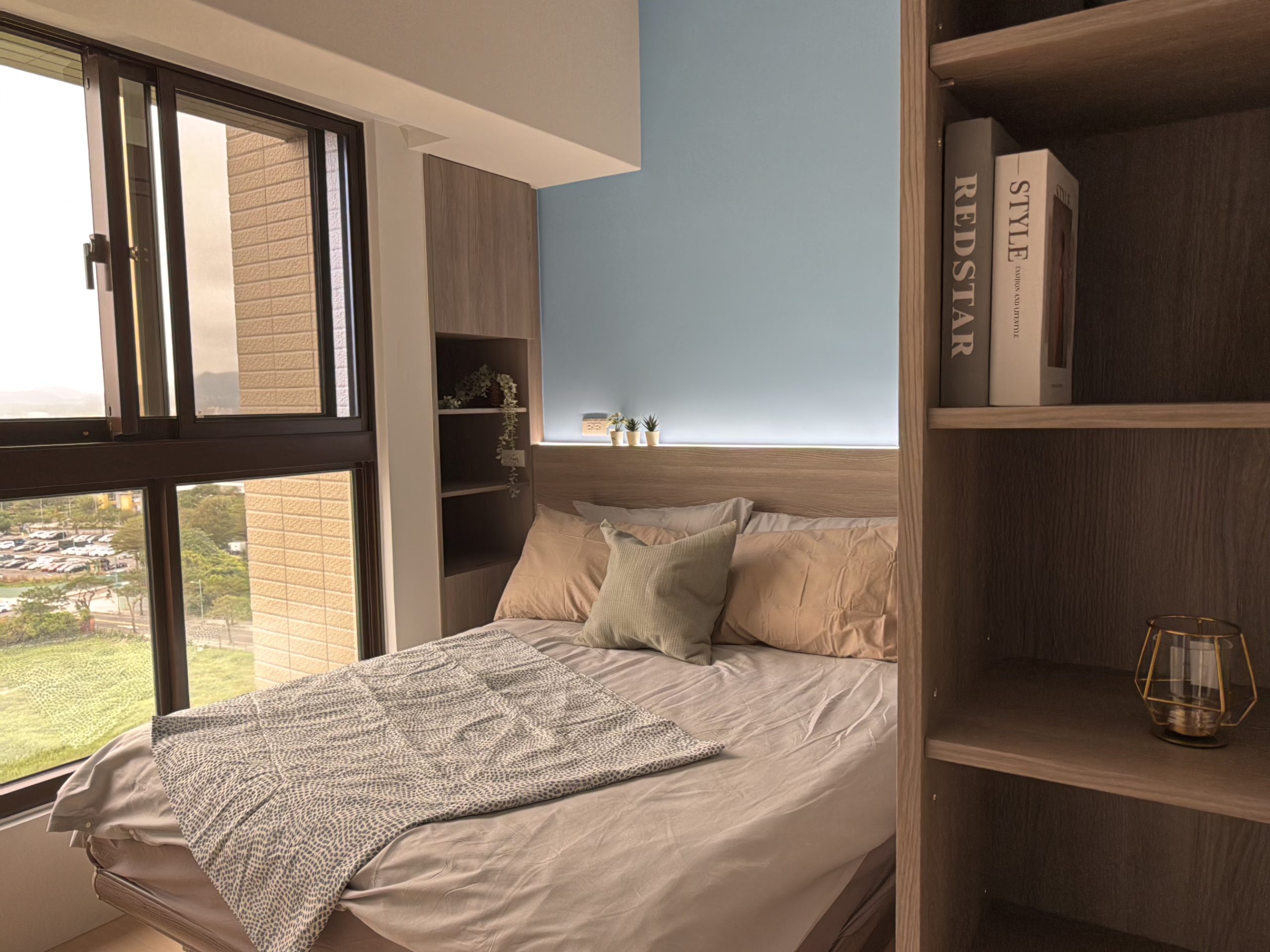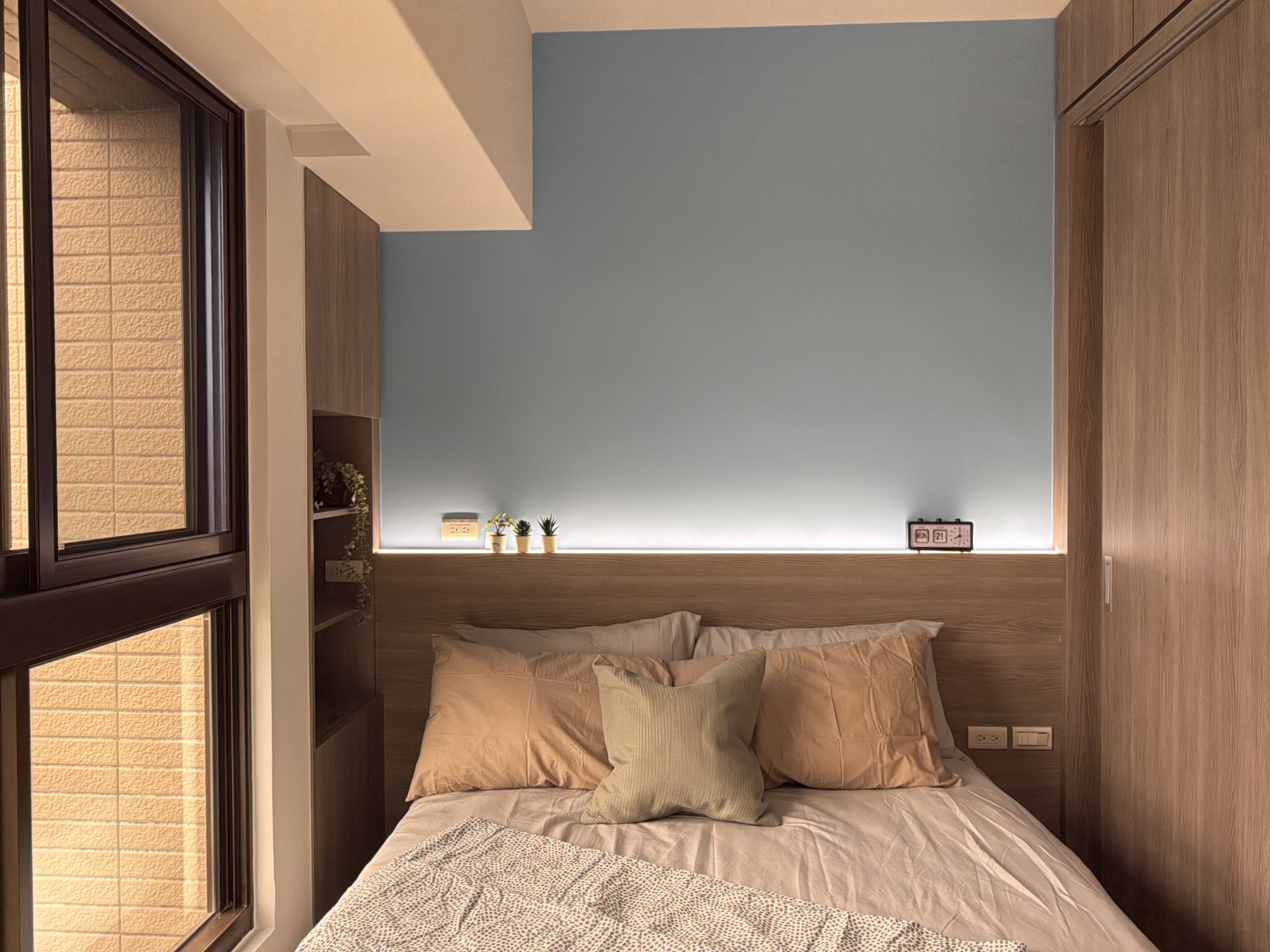 🛏️ 主臥|天空藍跳色牆+滿牆收納櫃,美觀又有個性。