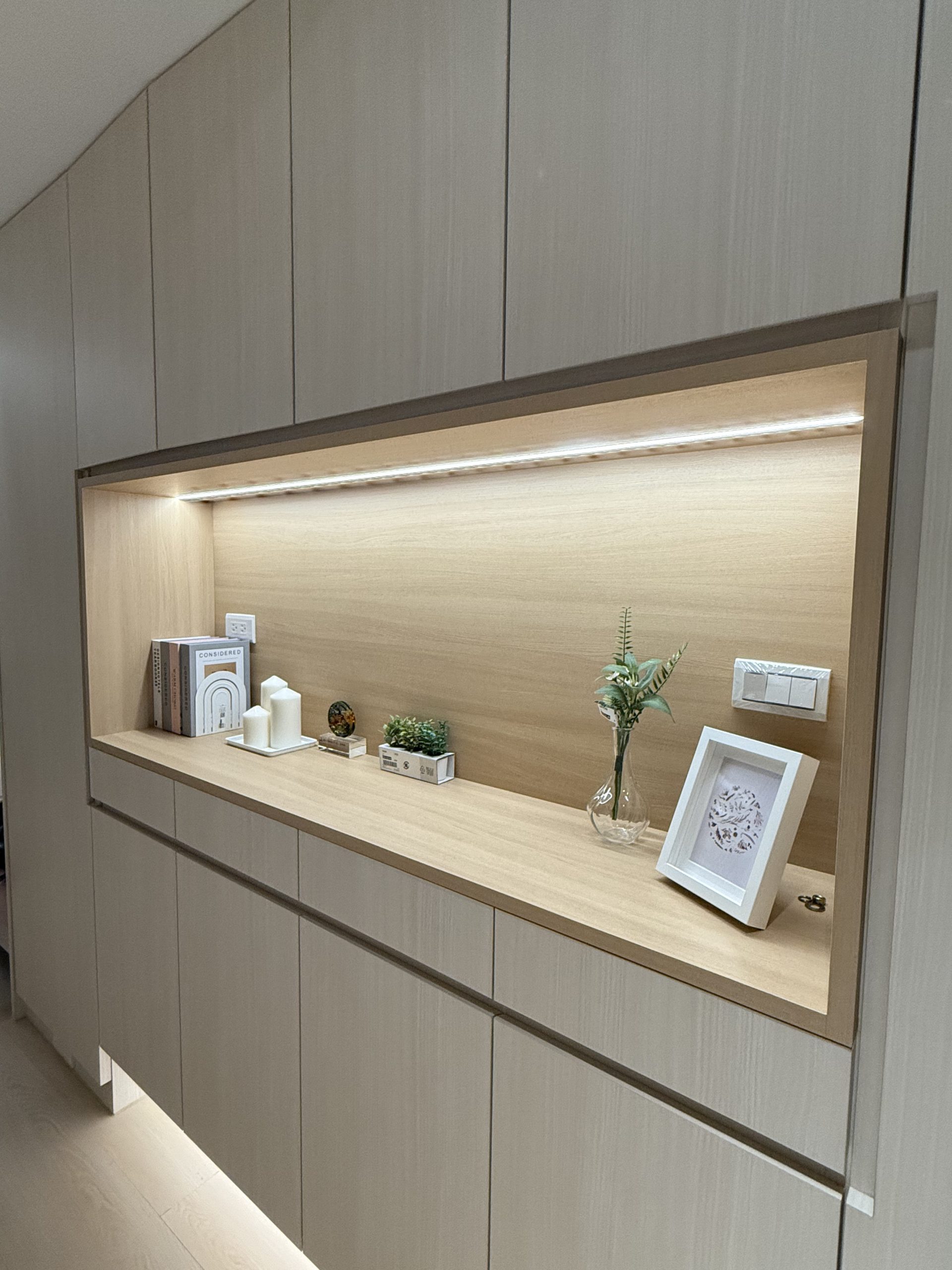 ✨ 天花板也收納|過道、收納櫃體上方設有隱藏櫃,把不常用物品都收到天花板上,空間不擠也不亂。